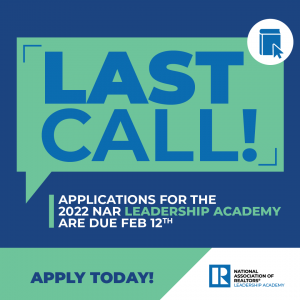 NAR PULSE—Remind your agents that the application deadline for the 2022 National Association of REALTORS® (NAR) Leadership Academy is Feb. 12, 2021! This program identifies, inspires and mentors emerging leaders from the local and state association level, and allows future leaders to experience multiple facets of leadership and define their leadership style along the way.